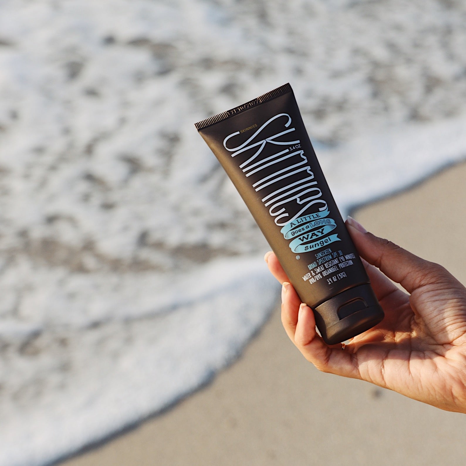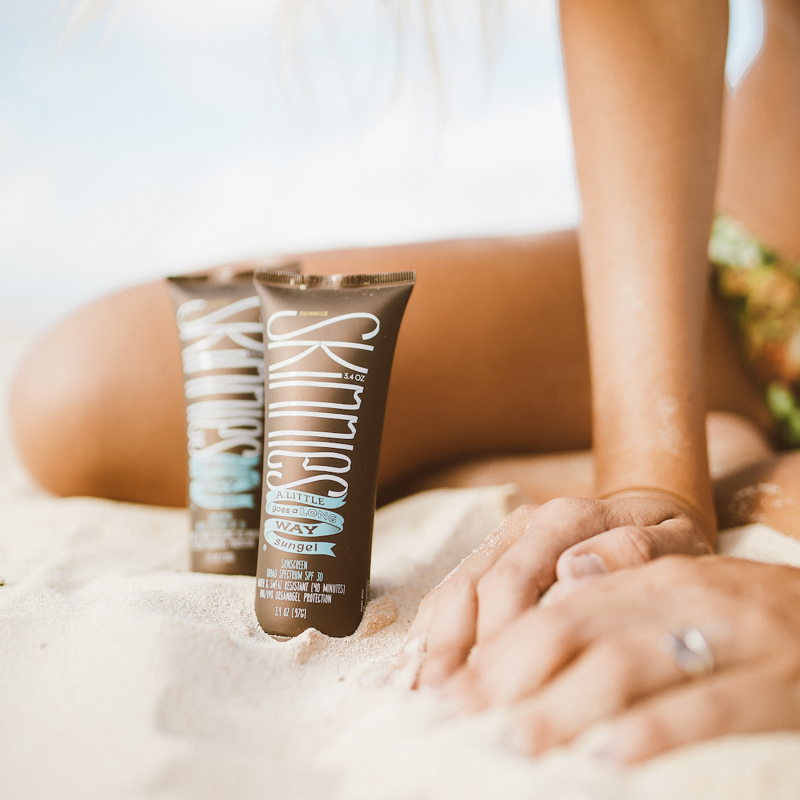 Wasser schützt nicht vor der Sonne. Herkömmliche Sonnenschutzmittel bestehen aus 50-70 % Wasser (verrückt, oder?). Also haben wir beschlossen, das Wasser einfach wegzulassen. Das bedeutet, dass Skinnies besser für die Umwelt ist, weil wir kein Wasser verschwenden. Und da Skinnies nicht verdünnt wird, wirkt der Sonnenschutz wie ein Konzentrat, das auf der Haut haften bleibt und somit länger seine Aufgabe erfüllt – nämlich deine Haut zu schützen.